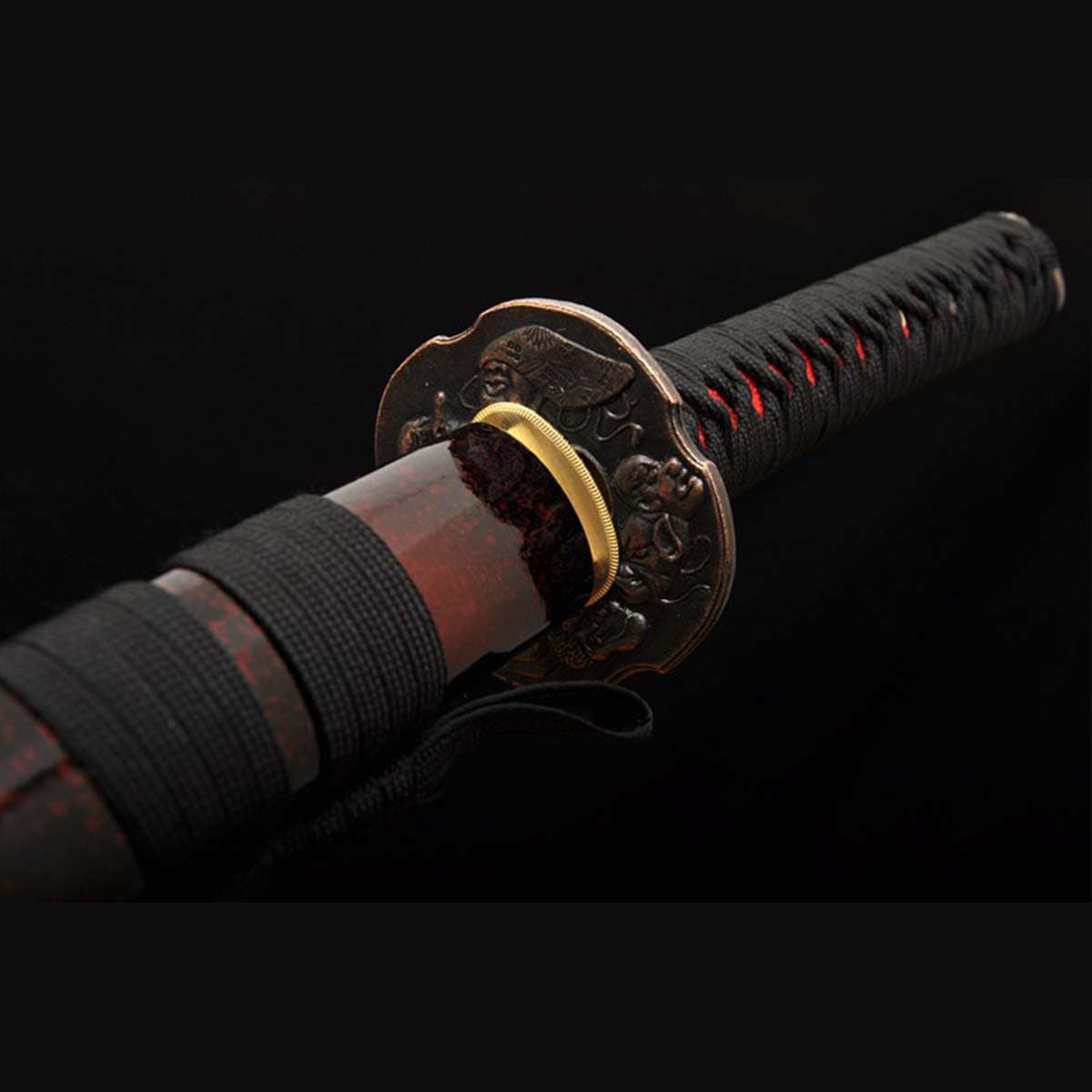 - Handle (Tsuka): Built from hardwood, it’s wrapped in red genuine ray skin (samegawa) for a grippy feel. Premium black silk thread (tsuka-ito) is tightly woven for extra strength and a sharp look. Two bamboo pegs (mekugi) lock the full tang blade in place, so it’s rock-solid.