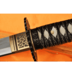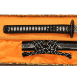 The saya (scabbard) is manufactured from hardwood with a graceful black-and-white give up. A thick matching sageo is tied across the polished copper kurigata, and the koiguchi is strengthened for durability.