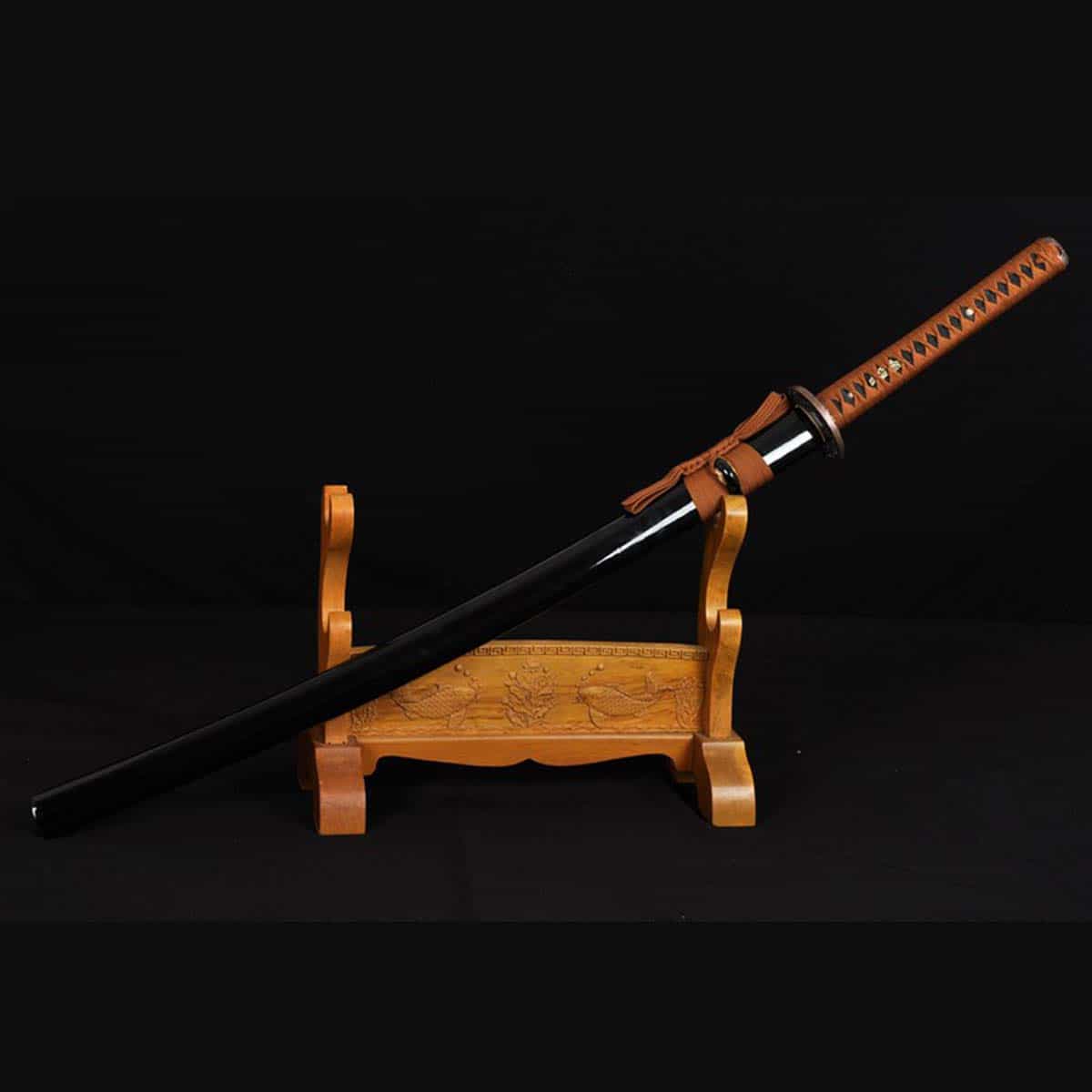 - The scabbard is crafted from wood with a black gloss finish and a hardened koiguchi (mouth) for durability.