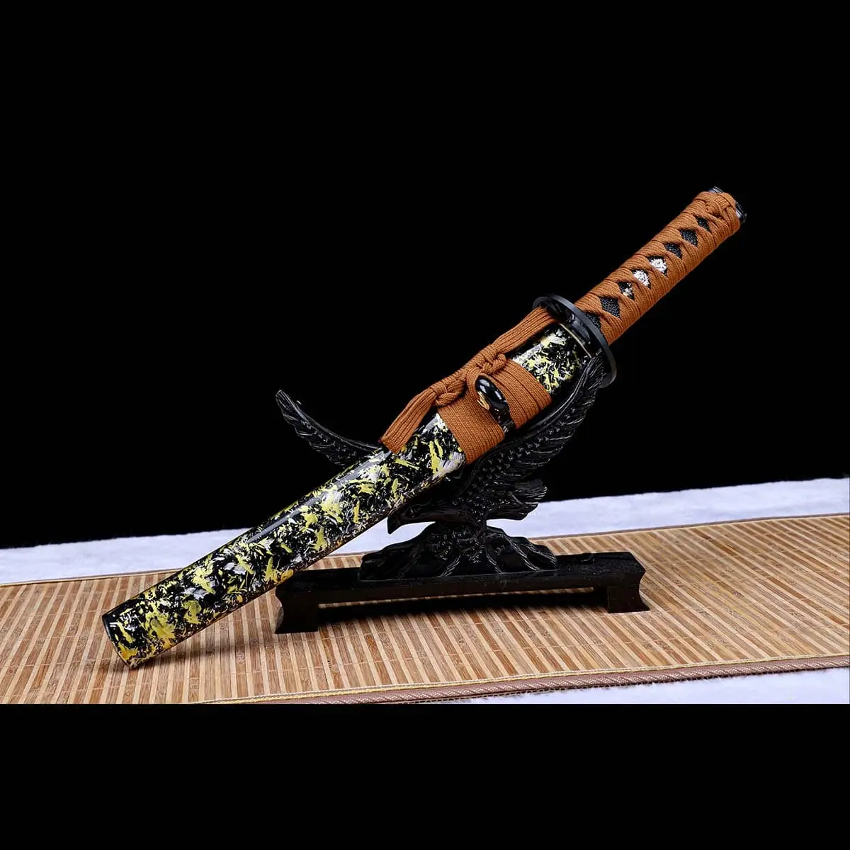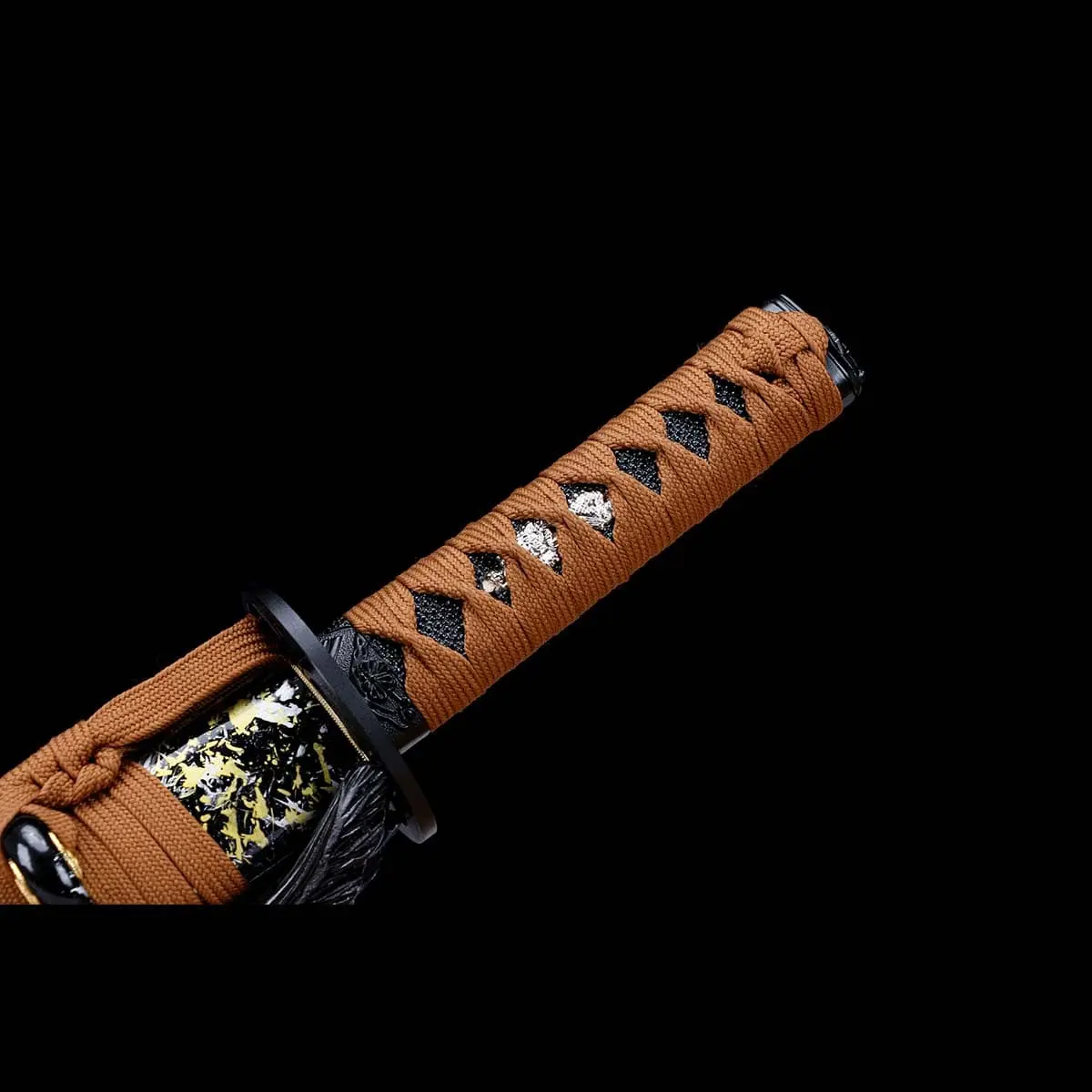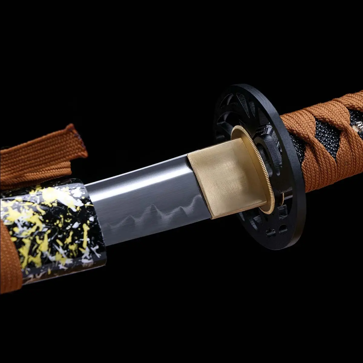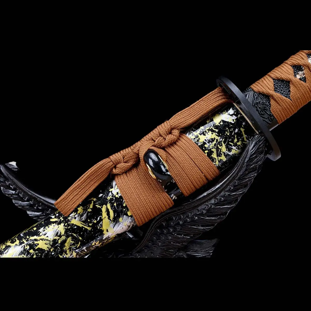 A black base is accented with yellow and white splashed patterns, creating a calm, composed visual rhythm with depth and restraint. A brown cord sageo is knotted securely, adding contrast and visual strength. The overall design feels balanced and mature—protecting the blade while enhancing its aesthetic presence.