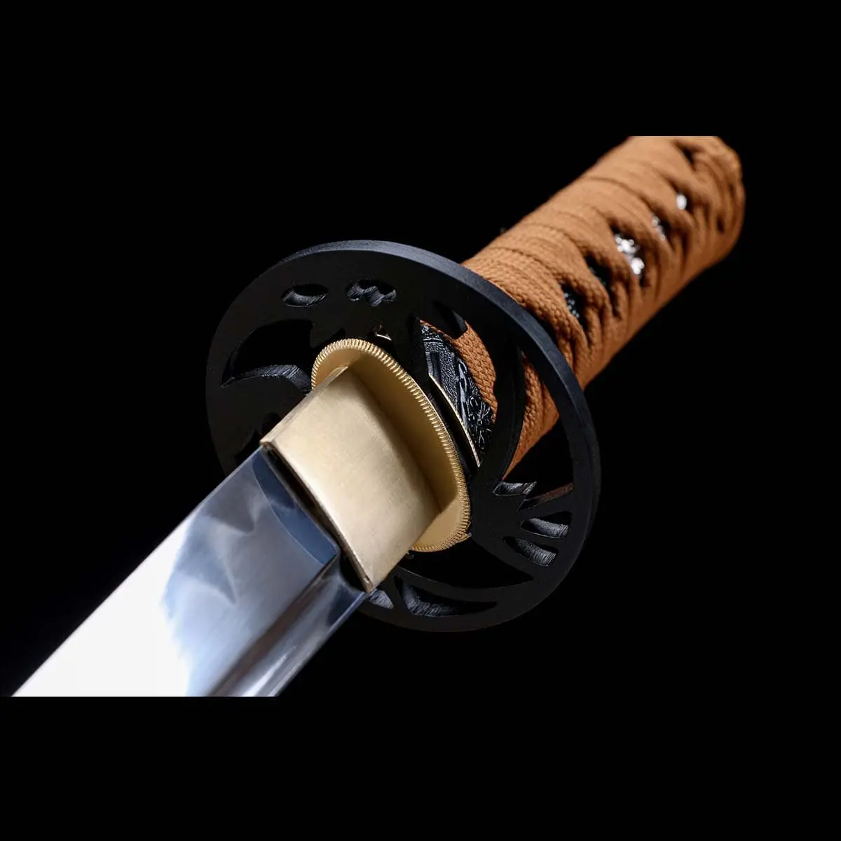 Finished in a deep matte tone, the tsuba contrasts strongly with the gold-coloured habaki, giving the sword a grounded, defensive presence that feels company and reliable rather than decorative.