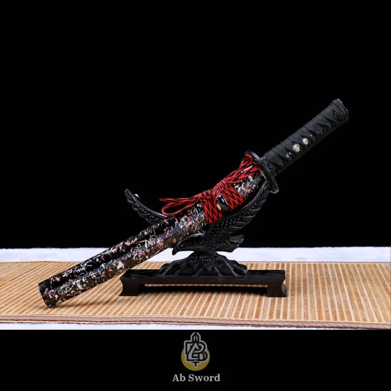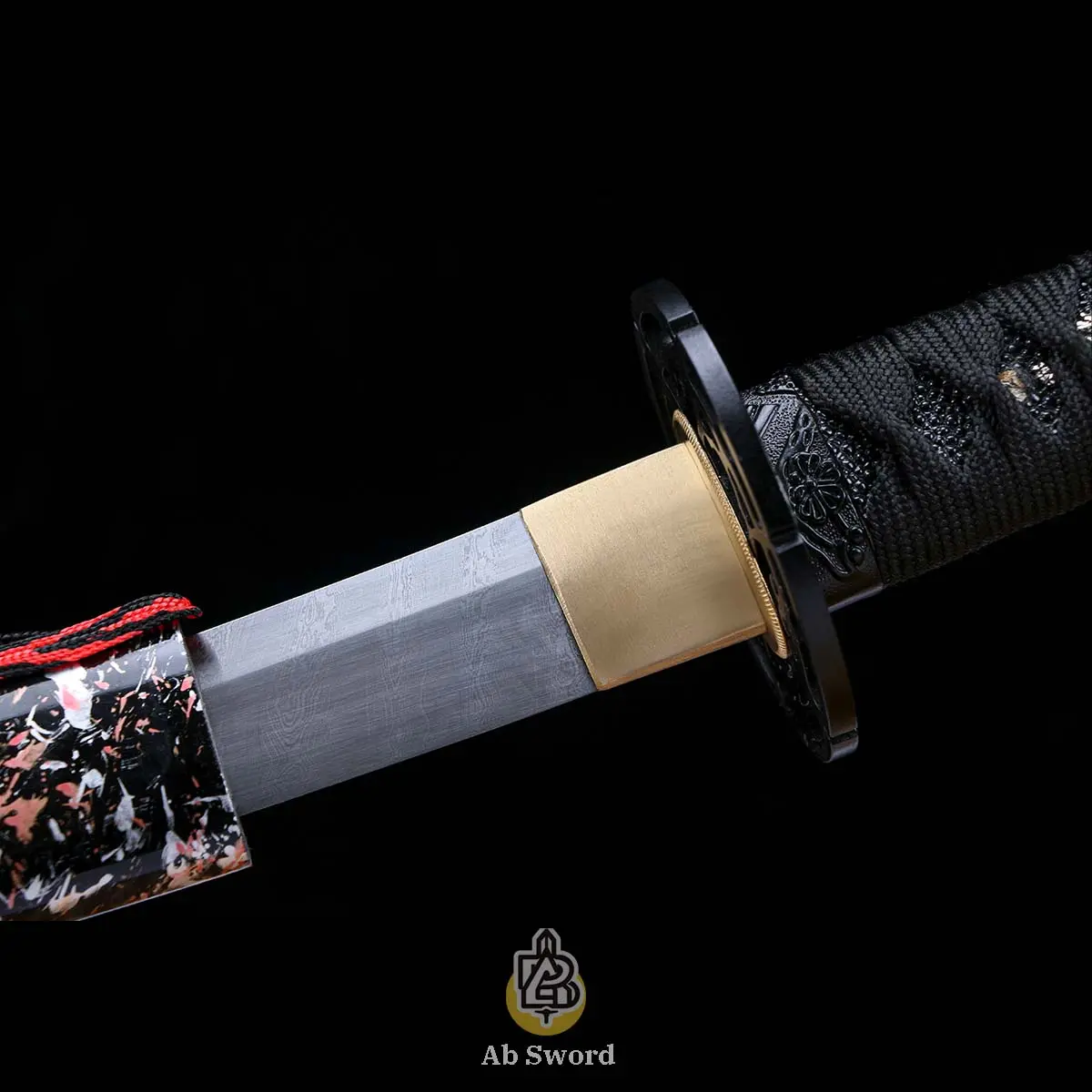 The hardwood saya is finished with traditional lacquer techniques and a dramatic black base with red and white splash patterns, inspired by falling sakura and battlefield embers. - Perfect Balance of Function, Art, and Collectibility
