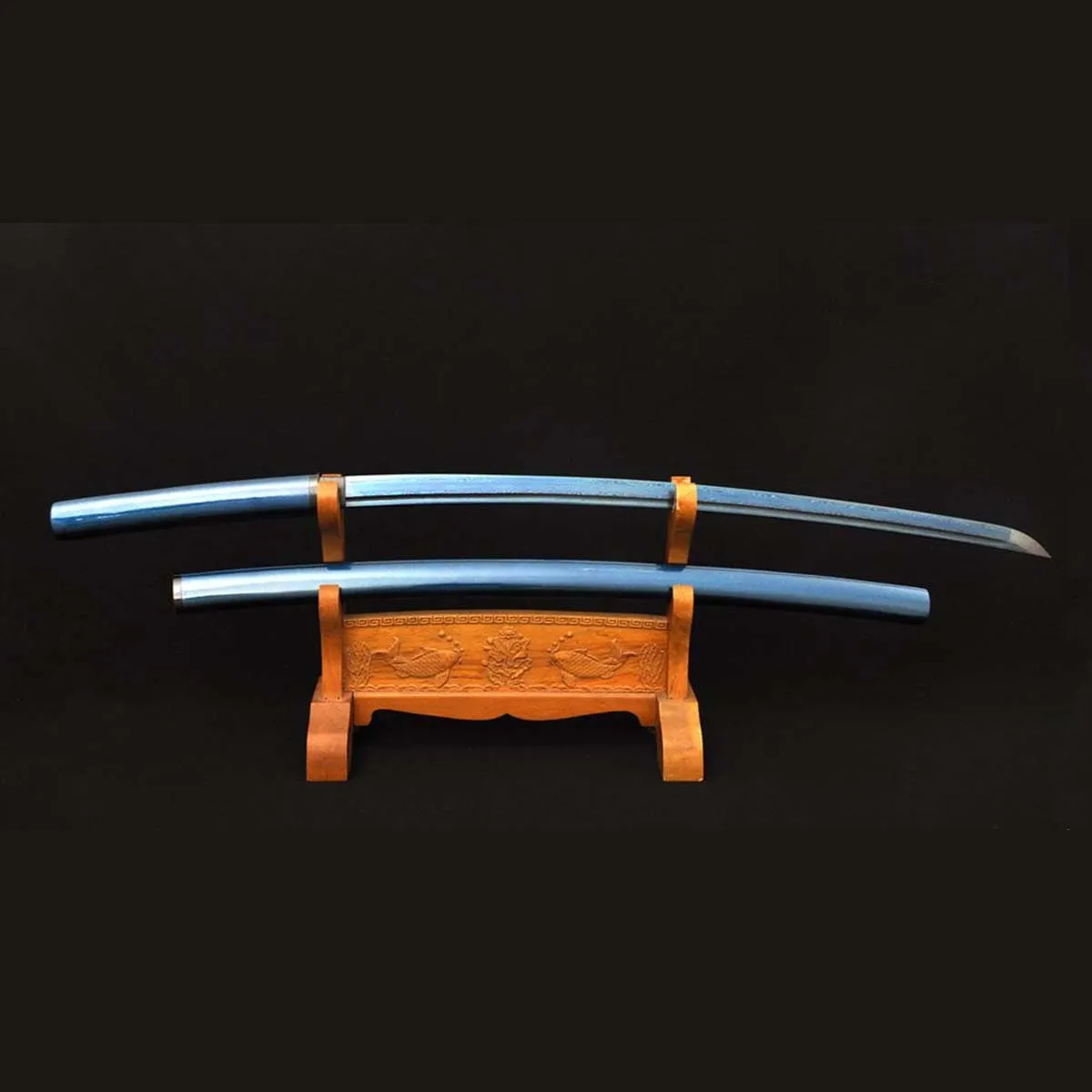 The blade features a prominent bo hi (groove) on each side, providing a lighter feel and satisfying sound with each swing, as well as fine-tuning the blade’s balance for superior handling. Eschewing the traditional tsuba, this sword boasts a wooden tsuka (handle), with a secure tang held by dual bamboo mekugi (pins). It is complemented by a matching hard wood blue saya (scabbard).