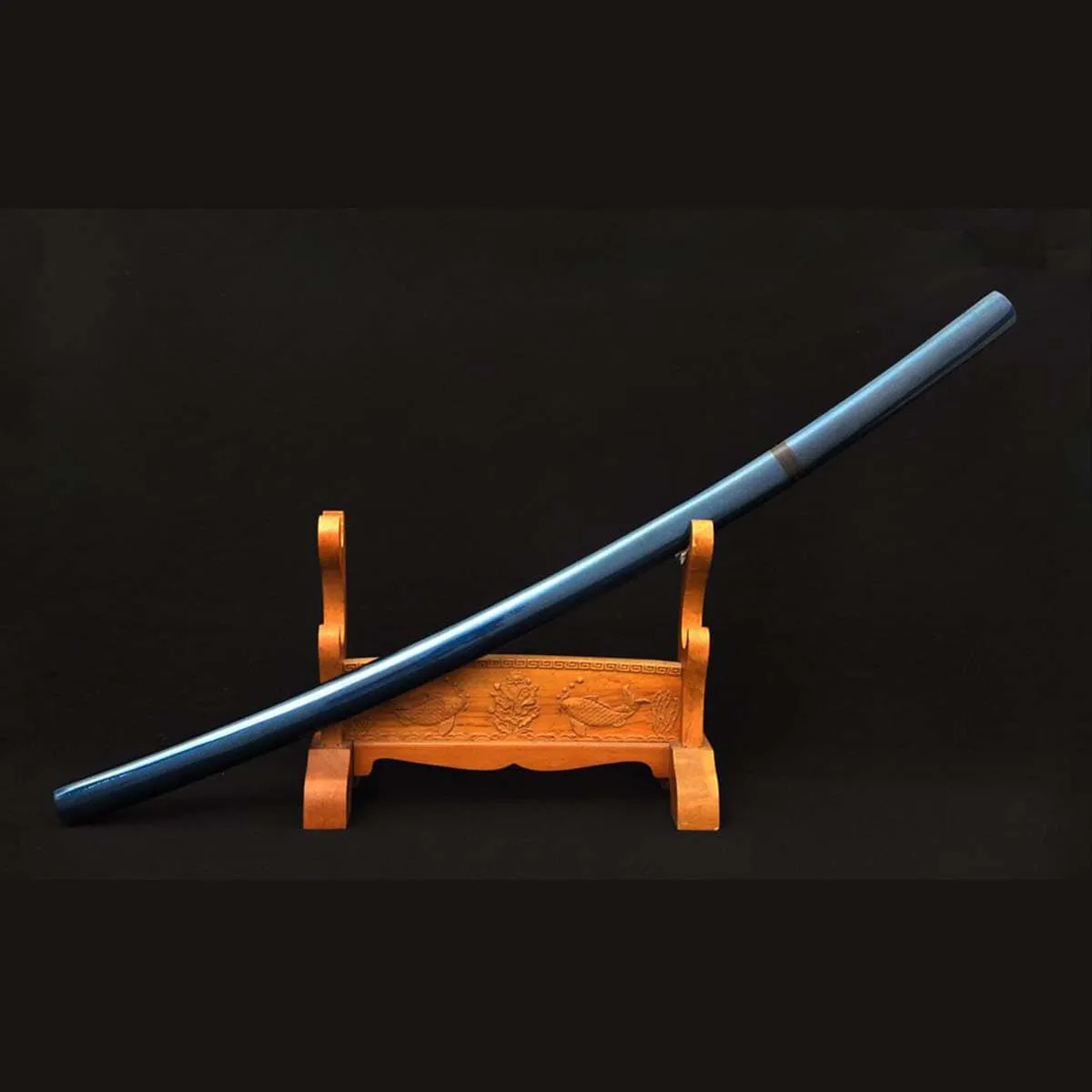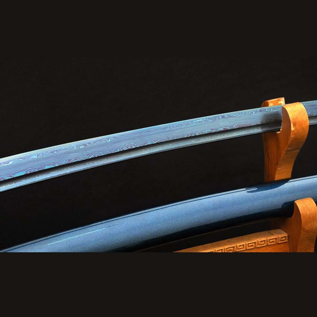 Discover the artistry of the Ab Sword Forge with this Shirasaya-style katana – a masterpiece handcrafted with age-old techniques. Its Damascus steel blade, expertly folded, unveils intricate layers that not only add to its strength but also to its visual allure. The unique blue hue on the blade results from an advanced electroplating process, enhancing its elegance and offering rust resistance.